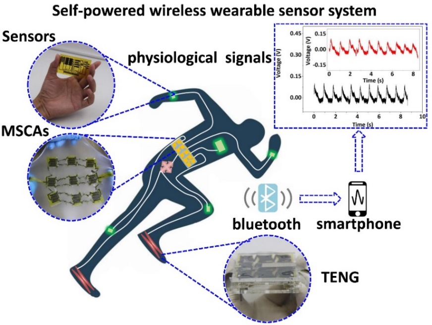 图1:基于人体自供能的柔性可穿戴传感器在线、连续监测人体生理信号示意图。