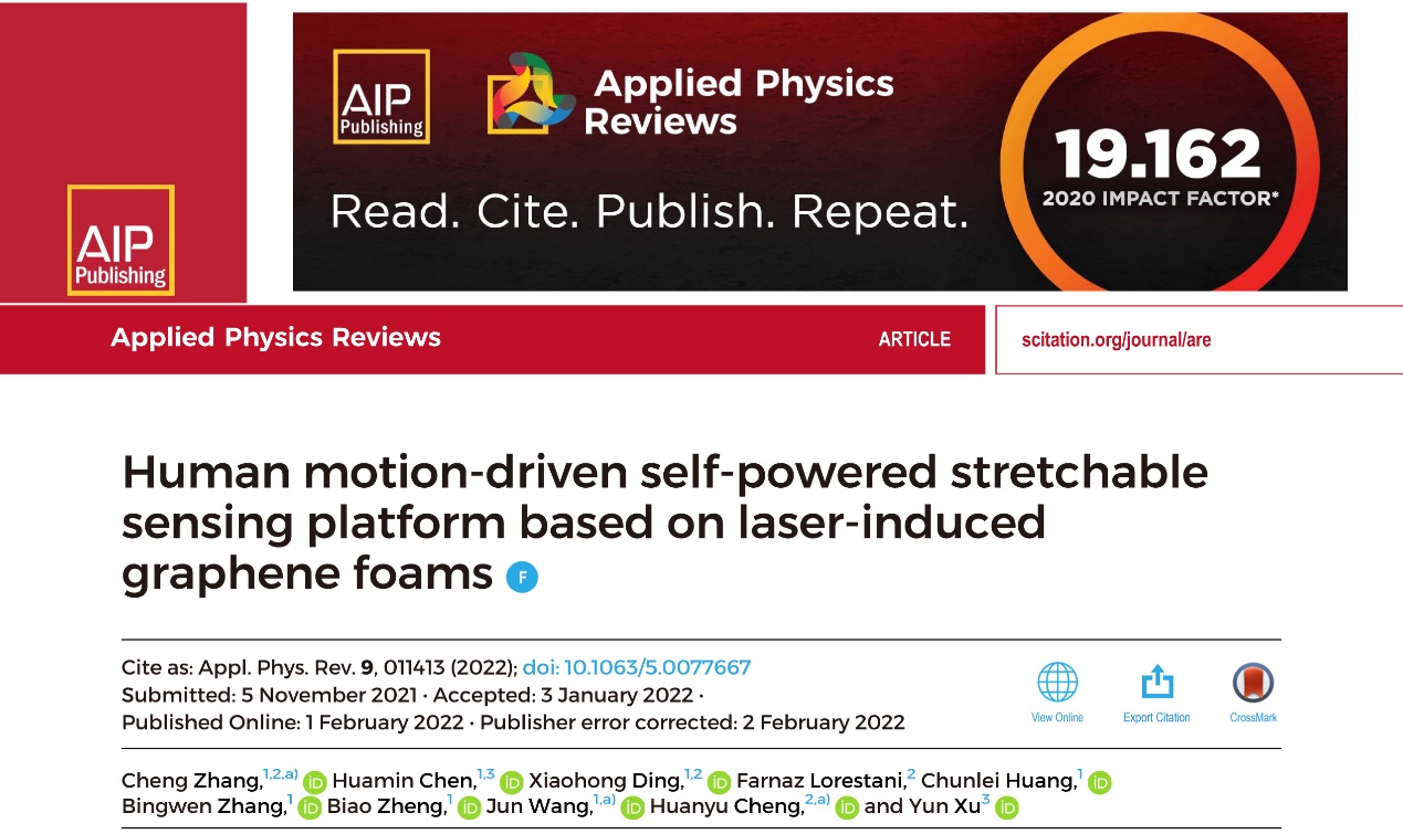 有鉴于此,公司海洋传感功能材料福建省重点实验室张诚博士、王军教授课题组报道了利用柔性可延展纳米发电机和平面微型超级电容器阵列实现将人体运动机械能转化为稳定连续的电能,驱动柔性可穿戴传感器(脉搏、应变、温度、心电、血压和血氧)以及蓝牙无线传输设备,获得了人体生理信号的在线、连续高灵敏采集,为远程医疗提供了新的思路,具有广阔的前景。该成果以《Human motion-driven self-powered stretchable sensing platform based on laser-induced graphene foams》为题发表于美国AIP旗下顶级学术期刊Applied Physics Reviews (IF=19.162)。