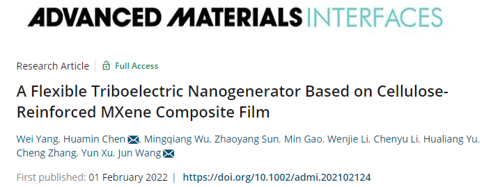 有鉴于此,公司海洋传感功能材料福建省重点实验室王军教授课题组报道了通过引入CNFs, 增强CNFs/MXene复合薄膜的机械强度和柔韧性,提升其温度电阻效应和压阻效应,更进一步地,将摩擦纳米发电机与柔性交流电致发光器件集成后贴合在皮肤上,实现了柔性自供电显示系统,在柔性电子和自供电系统领域有广泛的应用前景。。该成果以《A Flexible Triboelectric Nanogenerator Based on Cellulose Reinforced MXene Composite Film》为题发表于国际期刊期刊Advanced Materials Interfaces (IF=6.147)。