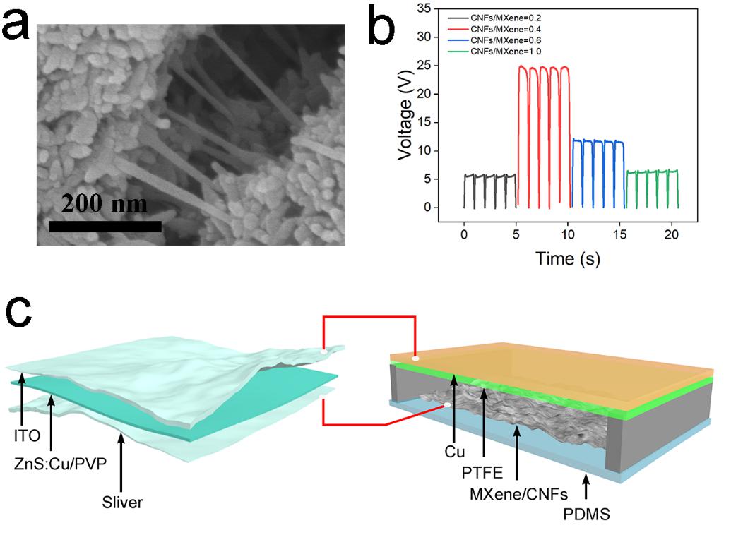 图a. CNFs/MXene复合膜SEM图;图b.不同组分下TENG的输出性能;图c.自供电显示系统结构示意图。