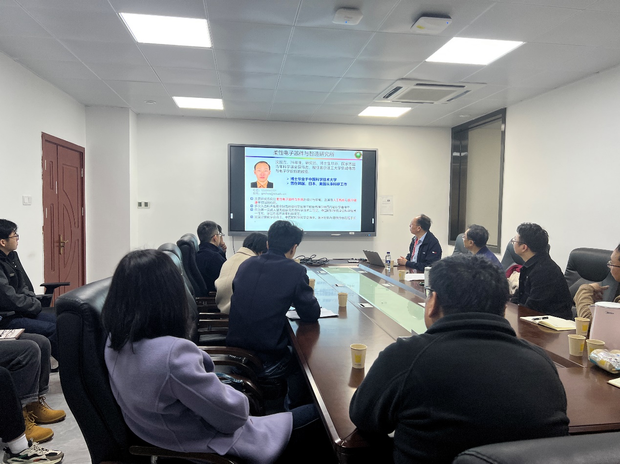 沈国震教授介绍了团队关于柔性电子器件工艺、应用于智能机器感知的柔性仿生电子器件、面向精准医疗和个性化理疗的仿生传感器、多功能柔性与可穿戴电子系统等研究进展,并和参会老师进行了互动讨论。