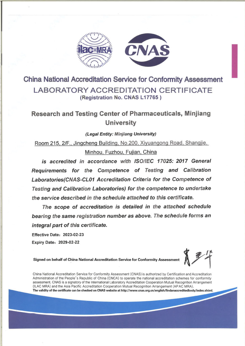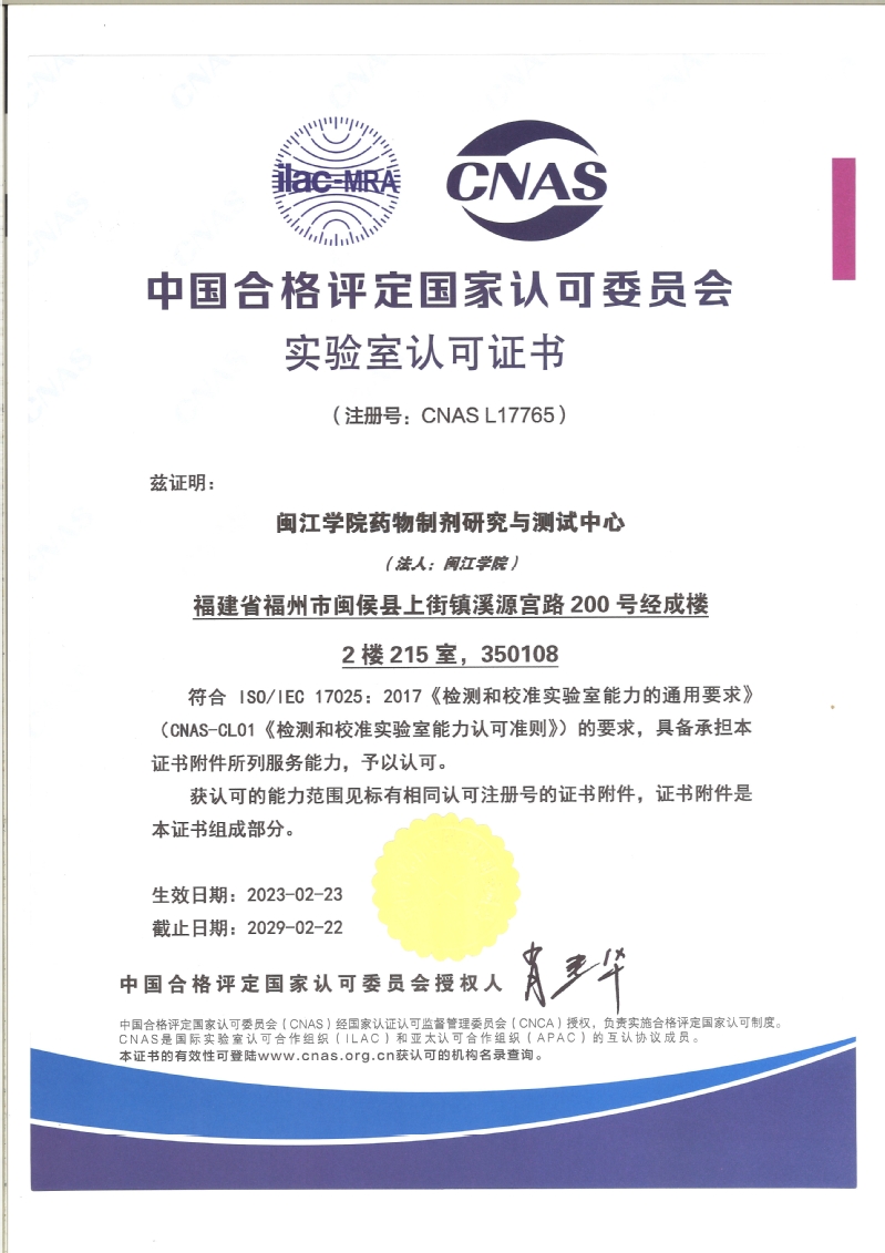 中心秉承公司“不求最大,但求最优,但求适应社会需要”的办学理念,坚持“立足福州,面向市场,注重质量,突出应用” 的办学宗旨,围绕制药行业的技术瓶颈,利用分析化学和材料化学手段,开展药物分析和药物制剂相关研究与开发,中心于2023年2月23日获得CNAS实验室认可证书(注册号:CNAS L17765)。