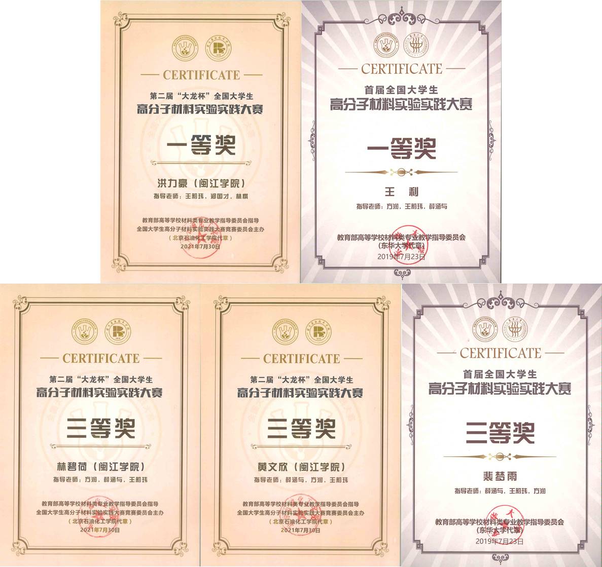 高分子材料基础(双语) | 省教育厅关于公布2019年省级精品线上线下混合式课程和慕课应用型本科教学团队立项的通知-闽教高[2019]20号 | 2019 | 王莉玮 |