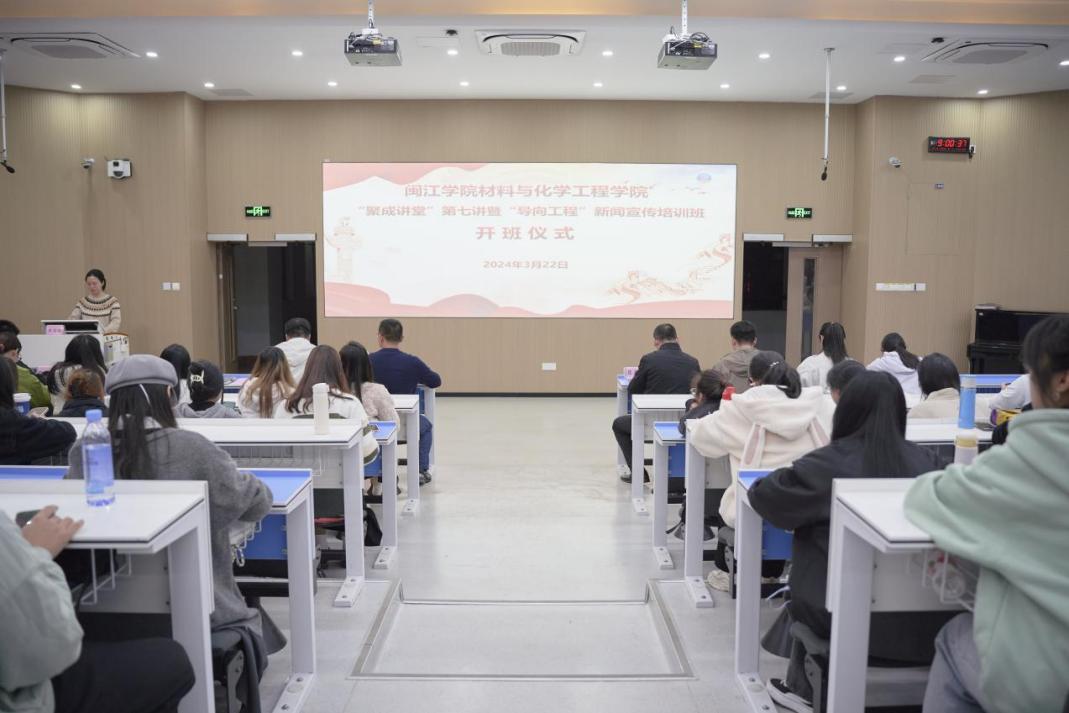3月22日晚,william威廉英国官网“聚成讲堂”第七讲暨“导向工程”新闻宣传培训班开班仪式在教学楼1A207举办。公司党委副书记蔡炎辉、全体辅导员和团学干部干事,各班班长、团支部书记、宣传委员参加,开班仪式由院团委负责人黄诗佳主持。