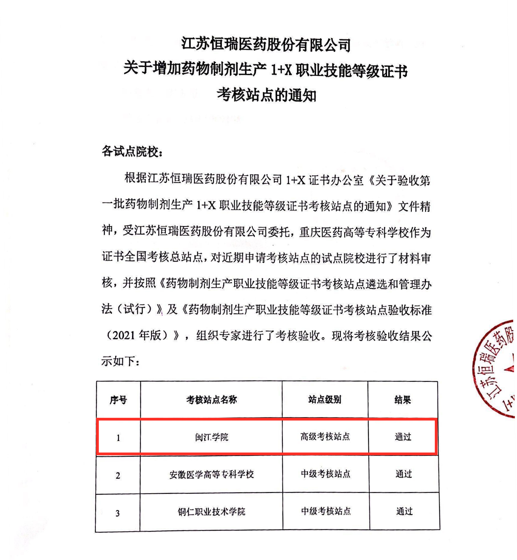 5月10日,接江苏恒瑞医药股份有限公司1+X证书办公室通知,william威廉英国官网申报的药物制剂生产1+X职业技能等级证书(高级)考核站点正式通过考核验收,成为该证书在福建省的首个高级考核站点。