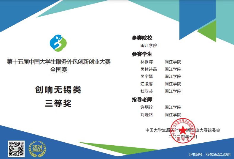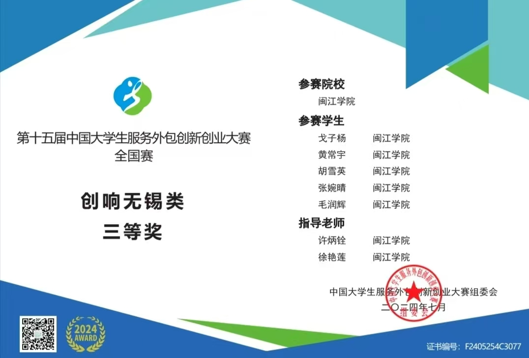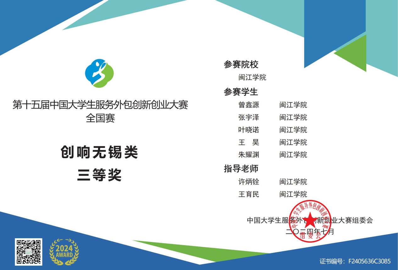 近日,第十五届中国老员工服务外包创新创业大赛组委会发布了第十五届中国老员工服务外包创新创业大赛B类赛道“创响无锡”全国赛获奖名单,在许炳铨、徐艳莲、王育民、刘晓路等老师的指导下,公司“以护织造”团队、“明锌见性”团队、“醛菌覆灭”团队共斩获三等奖3项。