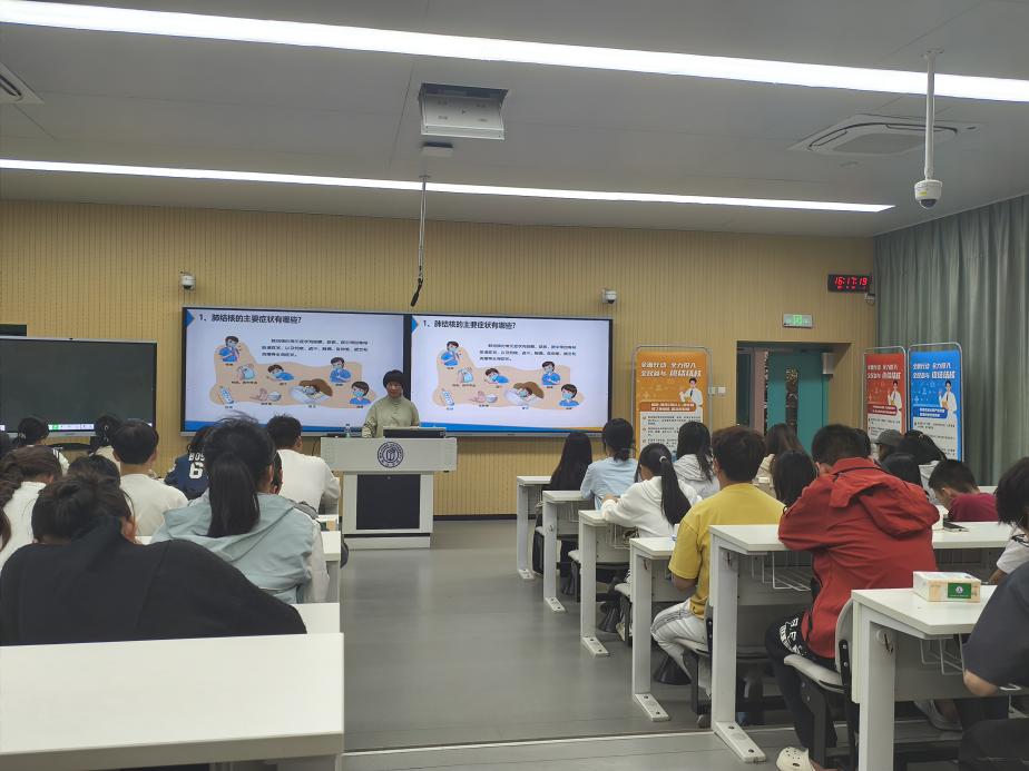 同时,在讲座过程中还设置了互动问答环节,同学们积极提问,老师耐心解答,并对参与问答的同学送上了精美的礼品,现场活动氛围浓厚。此外,活动现场还精心布置了结核病知识普及展架,同学们在聆听讲座之际,对照展架上的资料进行了深入探讨,加深了他们对结核病的理解,并且提升了他们对疾病预防的警觉性。