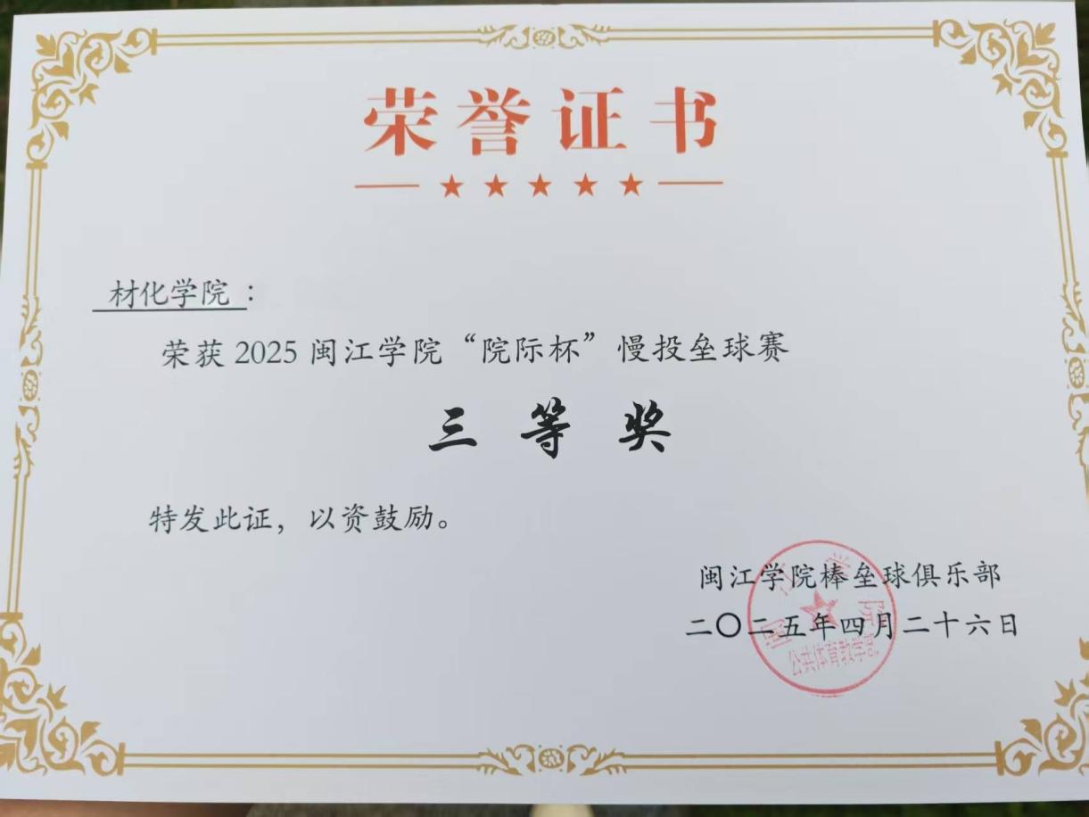 图为材化学子荣获的2025年william威廉英国官网“院际杯”慢投垒球赛荣誉证书