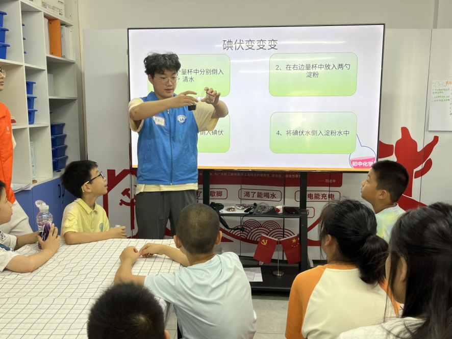科学启蒙是贯穿活动的主旋律,用奇妙的实验将科学的魅力具象化呈现。7月2日开营首日,实践队员陈凯晶带来的 “百变的它” 实验课就点燃了孩子们的热情,通过氧化还原反应理论讲解与“透明的可乐”“特工密信”等趣味实验,将抽象化学原理转化为直观认知。7月4日的“奇妙溶解之旅”中,彩虹糖溶解实验以色彩斑斓的“彩虹圈”现象引发惊叹,天气瓶制作环节则让孩子们通过混合樟脑、乙醇等材料,观察结晶形态变化,理解天气预测原理。7月6日,实践队员黄佳贤从生活入手,带领孩子们观察紫甘蓝汁在醋与小苏打溶液中魔幻般的色彩蜕变,通过碘酒与淀粉的经典显色反应,让孩子们亲手揭开身边化学的“神秘面纱”。而李琦函带来的“火焰掌”实验,更是将现场推向高潮。实践队员们继而引导孩子们动手操作高锰酸钾与维C、酸与碱的相互作用,在“酸碱之星球溶解”等实验中沉浸式体验物质变化的奇妙过程。“原来科学这么好玩!”“我也要做小科学家!”求知欲与好奇心被实验的“魔法”彻底点燃。