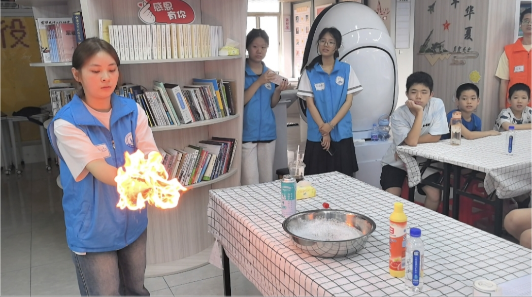 图为实践队员讲解趣味化学实验