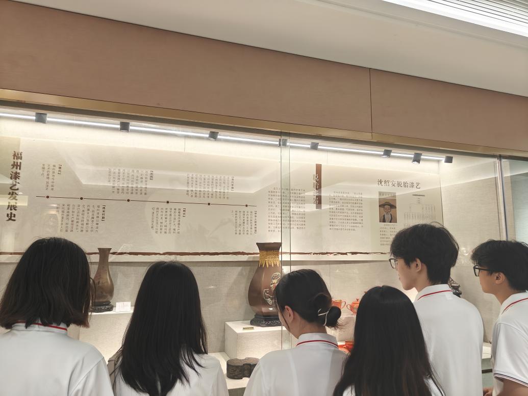 图为实践队员在福州市非物质文化遗产展示馆观看漆器展品
