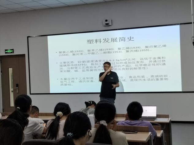 周岑老师首先简要介绍了塑料在人类现代文明中发挥的巨大作用以及随之而来的白色污染问题,进而引出“升级回收”的概念,指出塑料的“升级回收”不是将废旧塑料转化为低价值的再生材料,而是通过一系列化学或物理过程,将废弃塑料转化为具有更高经济价值和应用潜力的新材料或化学品,实现环境效益与经济效益的双赢。而后,周岑老师分别介绍了聚对苯二甲酸酯,聚苯乙烯,聚氯乙烯,聚乙烯,聚丙烯以及聚四氟乙烯等塑料的升级回收实例,结合对案例的讲解,向大家展示了塑料升级回收是科研前沿十分活跃的一个领域,甚至改写了教改和科普读物中长期流传的一些固有观点,但很多创意却又来自基础有机化学课本中的一些简单的小分子转化模式。讲座的最后,周岑老师鼓励大家认真学习大学专业课程,夯实基础,并保持对科研前沿的关注,在未来的科研工作中展示自己的创意。