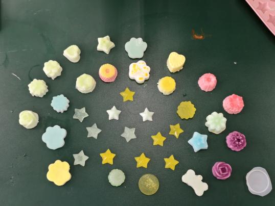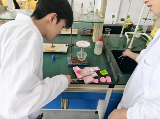 随后同学们自由组队,迅速投入到“化学家”与“设计师”的双重角色中。同学们按指导操作,称量皂基、水浴加热、滴入色素、调配香氛……每一个步骤都考验着耐心与细致,实验室里洋溢着专注而欢快的气息。待所有步骤完成后,同学们将混合均匀的皂液倒入模具,静置冷却成型后脱模,一件件造型各异、香气宜人的手工皂陆续诞生。
