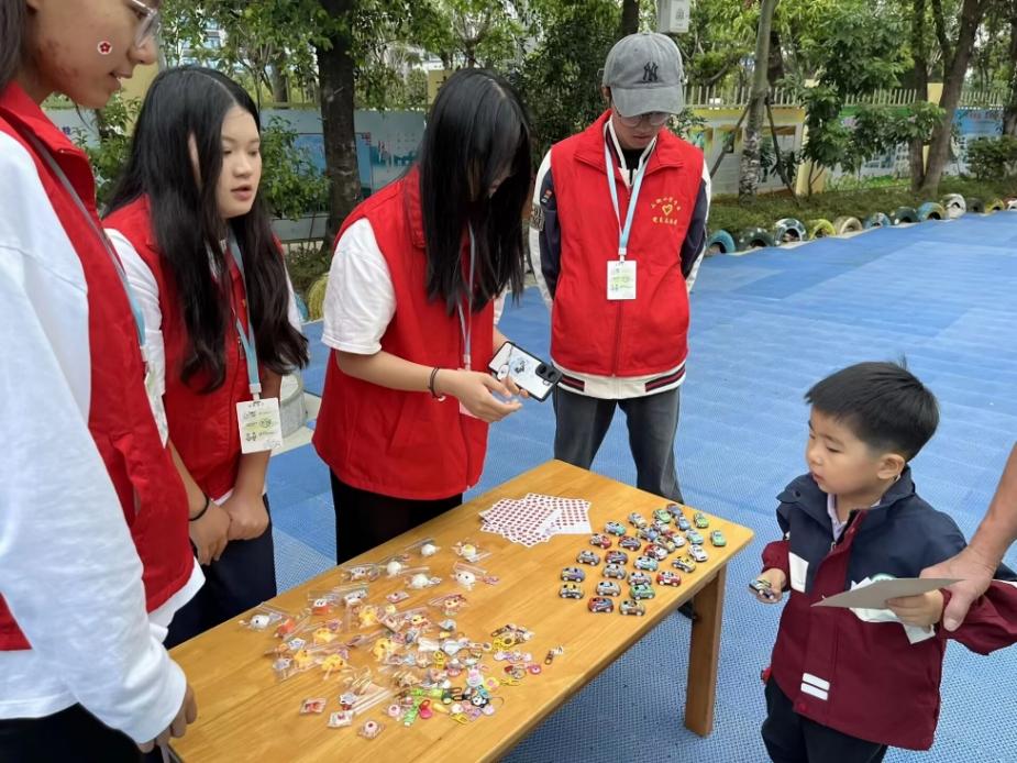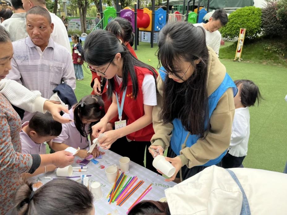 红色敬老闯关小游戏环节则将活动气氛推向高潮。志愿者先向小朋友讲述红军进村尊敬老人的小故事,引导小朋友化身“小红军”,在志愿者们的陪同下组队挑战五大关卡。关卡挑战时,志愿者根据呼啦圈的大小灵活调整参与方式。“一圈到底”环节,志愿者手把手指导小朋友传递技巧,确保全员有序参与;“红色风车制作”环节,志愿者耐心示范纸杯裁剪、图案绘制及粘土固定步骤,帮助动手能力较弱的小朋友完成作品;“跳泥坑”环节,志愿者则在轮胎旁看护引导,保障小朋友跳跃安全;“合作套圈”环节,志愿者主动配合小朋友调整站位、协调动作,助力完成协作任务。闯关成功后,志愿者负责统计各队完成时间,为最快的队伍颁发特殊奖品,并为所有参与小朋友分发纪念礼品。最后,志愿者带领小朋友将礼物送给长辈,逐句引导他们说出重阳祝福语,让敬老情怀落地生根。