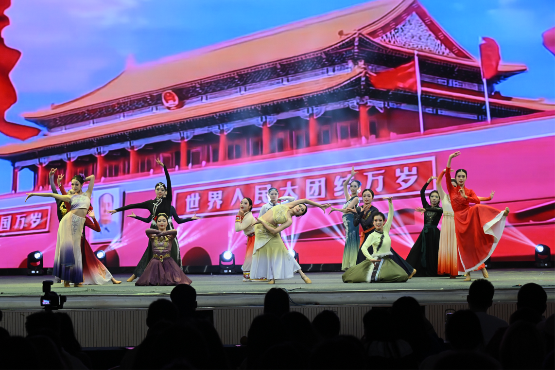 舞台之上,队员们身着绚丽多彩的各民族华服,服饰的精美纹样与特色配色尽显民族韵味,衣袂翻飞间宛如一幅流动的民族风情长卷徐徐铺展。她们的舞姿刚柔并济、收放自如:时而如江南丝竹般婉转柔美,步伐轻盈似流水潺潺;时而似塞外羯鼓般激昂奔放,动作铿锵如骏马奔腾。极具感染力的表演,为现场观众呈现了一场民族文化百花齐放的视听盛宴,赢得阵阵掌声与满堂喝彩。