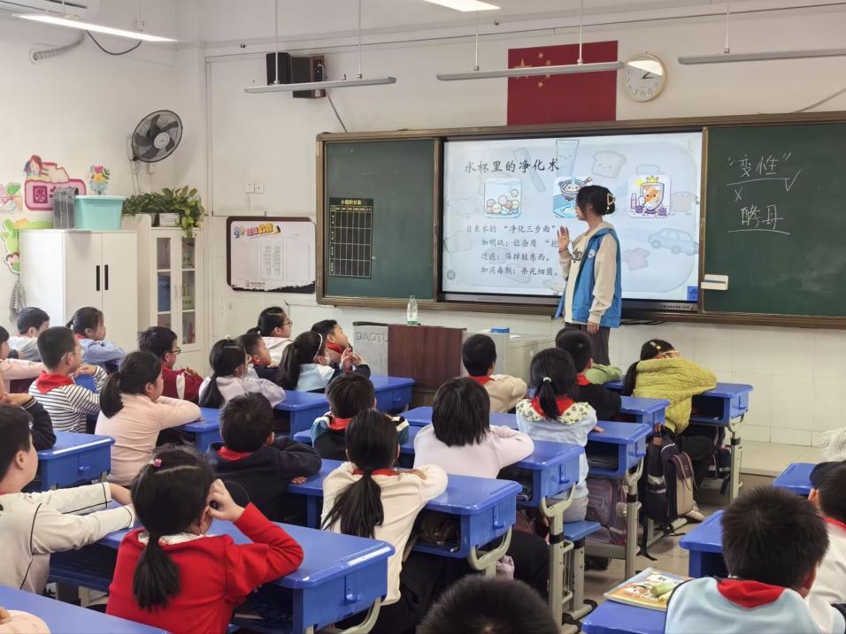 活动筹备阶段,志愿者团队秉持严谨细致的态度,对各类实验用品进行逐一核对、规范分装,从源头筑牢安全防线,确保活动顺利开展。课堂上,志愿者们以生活场景为切入点,用生动通俗的语言解析煎鸡蛋、烤面包等日常现象背后的化学奥秘,再延伸至自来水净化、衣物纤维特性、汽车能源应用及绿色环保等多个领域,将抽象的化学知识与生活实际紧密联结,瞬间点燃了孩子们的探究兴趣,课堂互动氛围十分热烈。